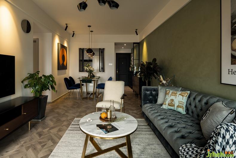 一面墻的尼絲絨綠搭配灰調的菱形復合地板提升了整個空間的復古感。