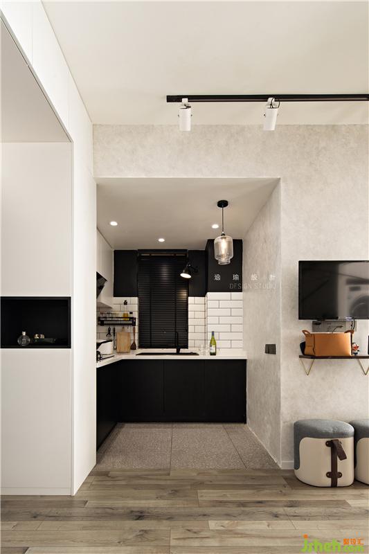 往左邊來就是廚房的空間,白色墻磚與黑色烤漆板櫥柜的經(jīng)典色搭配,作為無彩色系的黑白是色彩的兩個極端,他們單純而簡練,節(jié)奏明確,顏值高又簡約前衛(wèi),配上別致的燈光,氣氛便顯得更為溫馨。