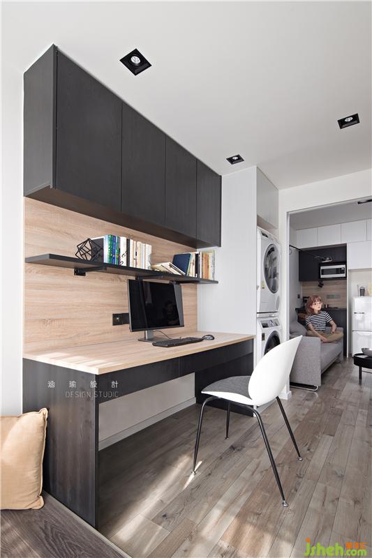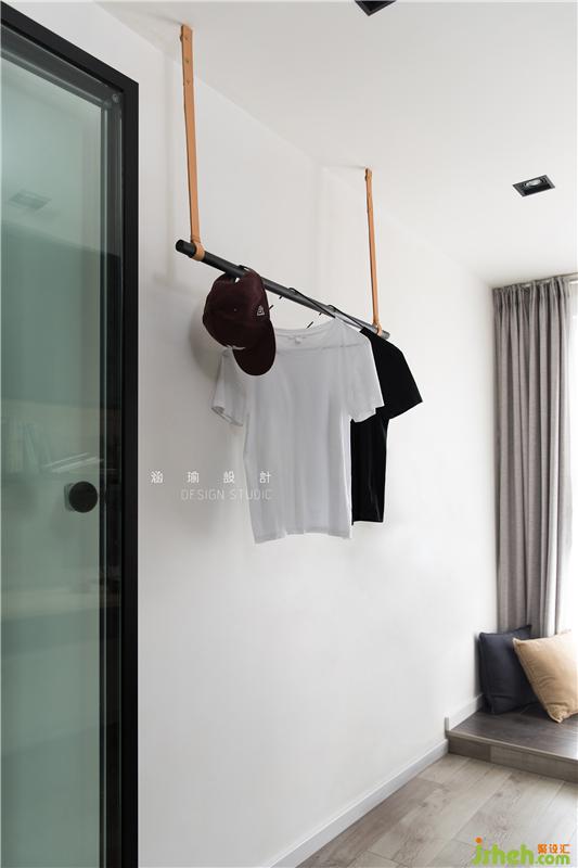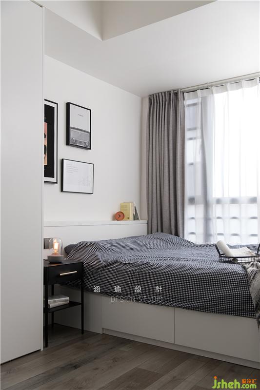 收納對于這對小情侶來說也是足夠的,除了衣柜,床的部分看起來不僅有安全感,床柜下還有一整面的儲物空間來收納生活衣物用品等等,實用性與美觀性并存。