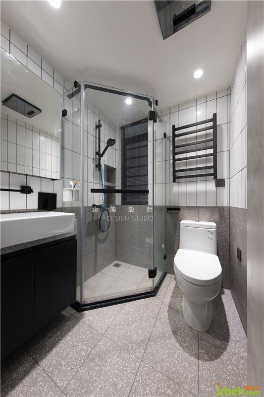 最后就是衛(wèi)生間的空間啦,它就隱藏在電視背景墻背后的空間里,同樣也是黑白經(jīng)典色搭配,小空間是不需要過多的裝飾,簡單細致的線條更能讓人放松。