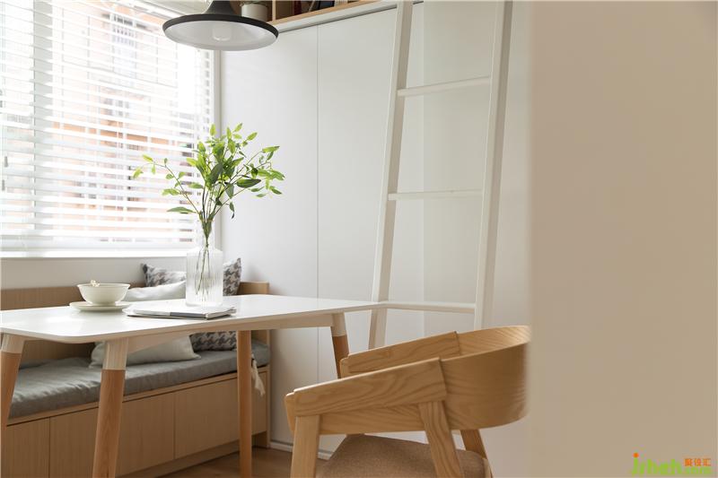 從走廊過(guò)來(lái)就是客廳與餐廳相連的空間,包括君君的學(xué)習(xí)區(qū)也在這個(gè)位置。經(jīng)過(guò)百葉簾的過(guò)濾,陽(yáng)光也成了家里自然唯美的裝飾。