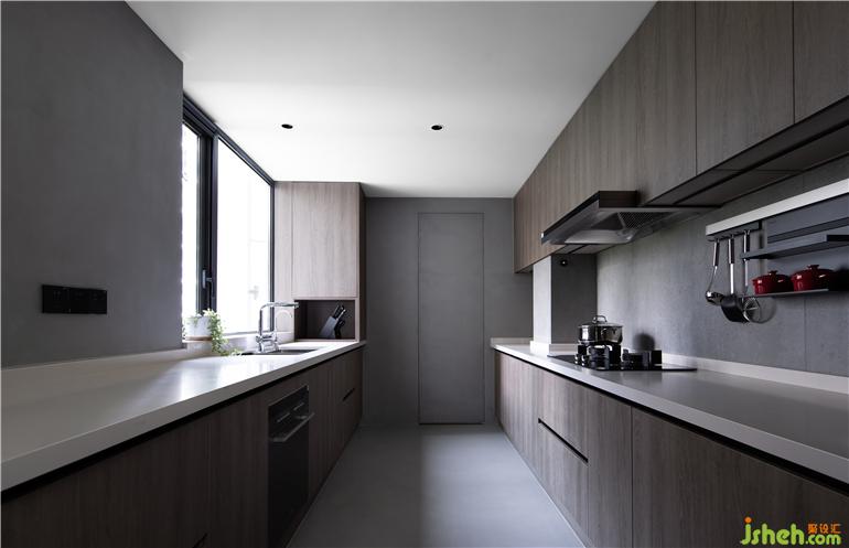 ② 餐廳處設(shè)置一體式島臺餐桌,并增加西廚操作區(qū)及餐邊柜,方便收納,同時擴大廚房的縱深,讓功能區(qū)間的面積趨于合理。