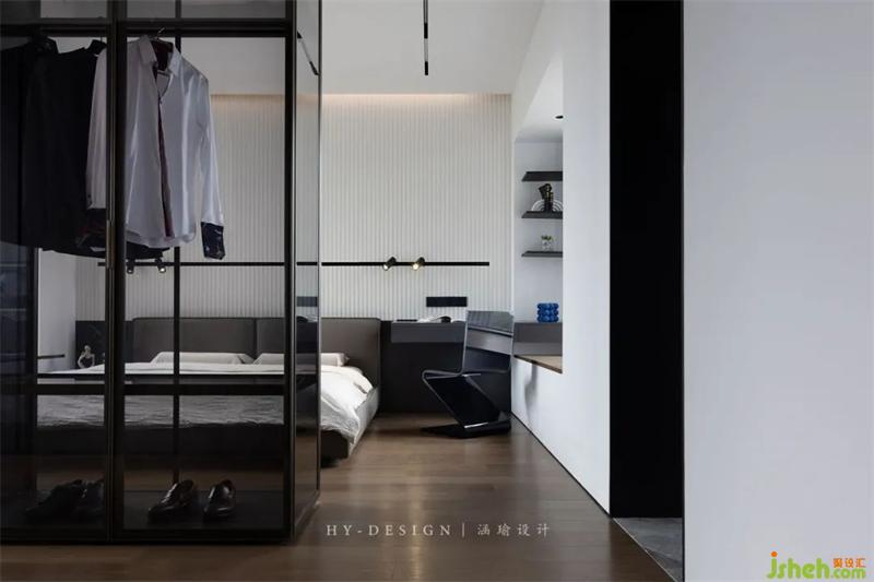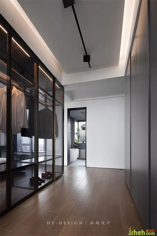 一旁是衣帽間,衣柜分列兩側(cè),中間留有寬敞的過道用于取物換衣。