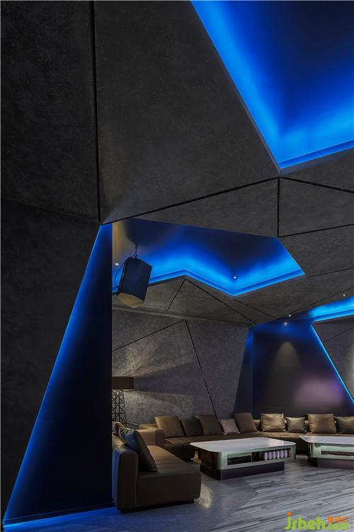 抽象結(jié)構(gòu)山的形態(tài),陡峭險(xiǎn)峻、結(jié)構(gòu)交錯(cuò),引人征服,深灰色毛石面和冷色調(diào)燈光相互呼應(yīng),咖色皮質(zhì)沙發(fā)、暖色燈光則提升整體空間的張馳度。