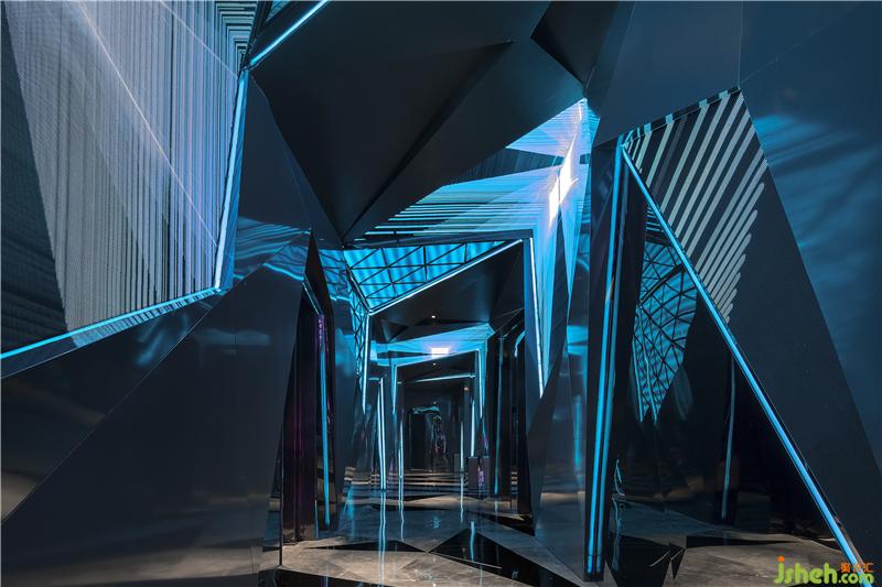 層層疊疊的幾何金屬構(gòu)件和影像塑造了整條走廊的遞進(jìn)節(jié)奏,并銜接了接待區(qū)的導(dǎo)引。