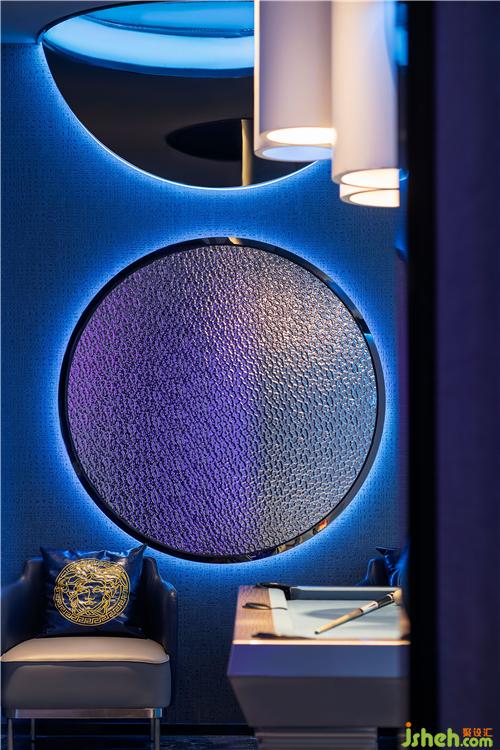 金屬材質(zhì)在燈光的隨機變幻中透出水晶般剔透的質(zhì)感肌理,與周邊的材質(zhì)形成對比,并且和整體空間的調(diào)性風格相呼應(yīng),讓人對室內(nèi)的設(shè)計和氛圍始終保有一種驚喜和交互感。
