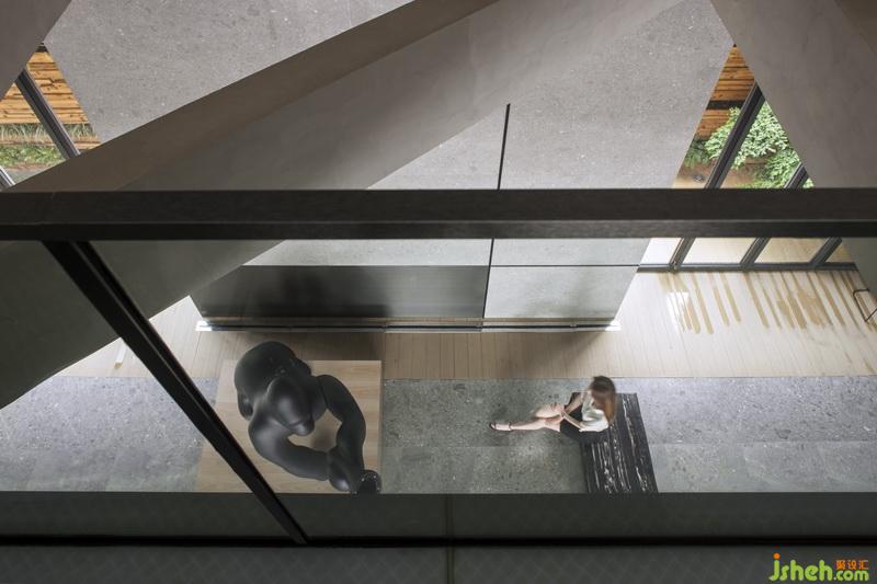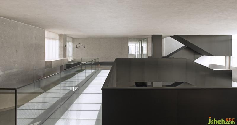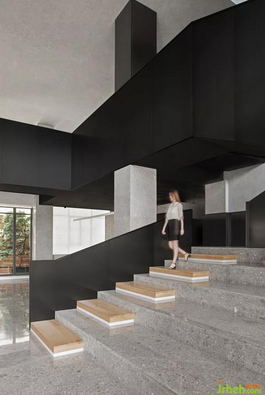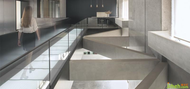 將原有建筑結(jié)構(gòu)幾何圖案,在形態(tài)上伸展變化,樓梯與天橋一貫而成,黑色拉絲不銹鋼隔板的運(yùn)用,把每一個(gè)簡(jiǎn)單幾何案變?yōu)橛械袼芨械淖髌罚臻g連接功能的實(shí)用性與藝術(shù)性的融合,讓視角空間有了靈動(dòng)。