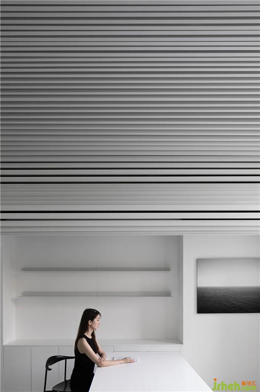 室內(nèi)進(jìn)門左排依次是接待室和兩間獨(dú)立辦公室,最主要的問題是沒有采光和不通風(fēng)。設(shè)計師在這三間房的側(cè)邊間隔出一個通道,佛山辦公室設(shè)計用軟膜天花和人造光打造成一個如能透進(jìn)自然光的“天井”,解決采光問題。其次通道連接三間房,打開接待室的后門,風(fēng)可以直接從通道引進(jìn)另外兩間辦公室。