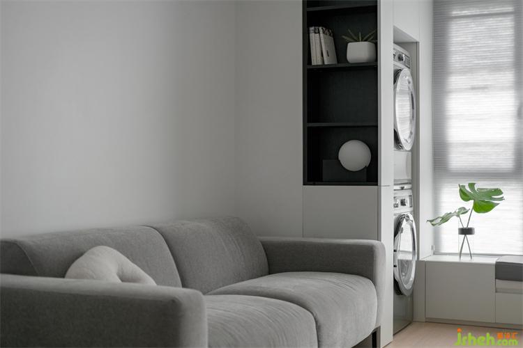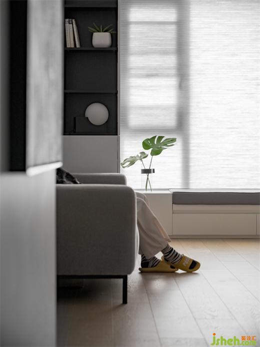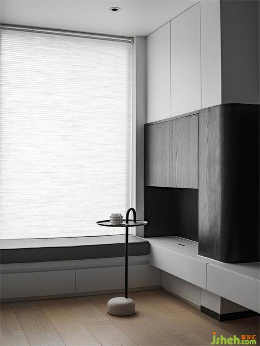 大面積的落地窗下安置的白色卡座,配上小小的邊幾,便成了休閑放松的小角落,下面的抽屜,也可用于收納家中的小物件,一線一面,都呈現(xiàn)出次序分明的空間狀態(tài)。