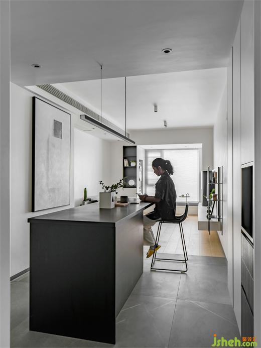 化繁為簡,空間打破原有閉塞的格局,家裝設(shè)計將客餐廚連成一體,半圍合式的客廳,休閑且隨性,餐廳島臺一字延伸,劃分出就餐區(qū),格局規(guī)整統(tǒng)一,黑白兩色構(gòu)建了整個空間,清晰而又生動。