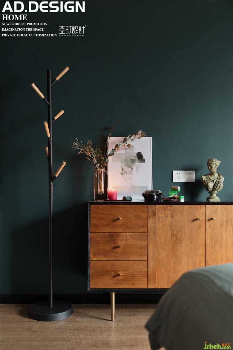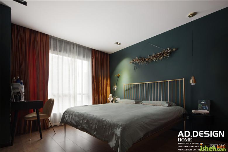 主臥全房的乳膠漆顏色室內(nèi)設(shè)計(jì)師都采用暗沉?xí)崦恋哪G色,點(diǎn)綴些許杏紅色在窗簾布料以及裝飾畫上,搭配上金色的鐵藝雙人床,讓整個(gè)空間的軟裝配飾更加突出。