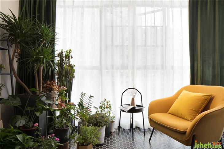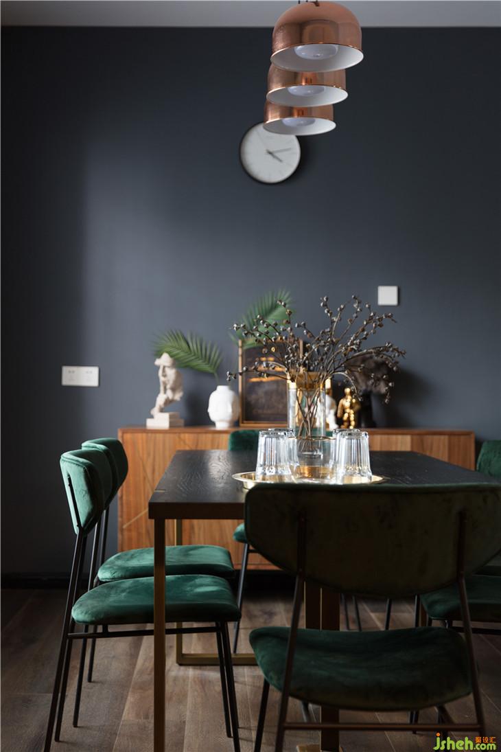 主臥全房的乳膠漆顏色都采用暗沉?xí)崦恋哪G色,點(diǎn)綴些許杏紅色在窗簾布料以及裝飾畫上,搭配上金色的鐵藝雙人床,讓整個(gè)空間的軟裝配飾更加突出。而杏紅色的窗簾背后則是通往衣帽間以及衛(wèi)生間的過道。