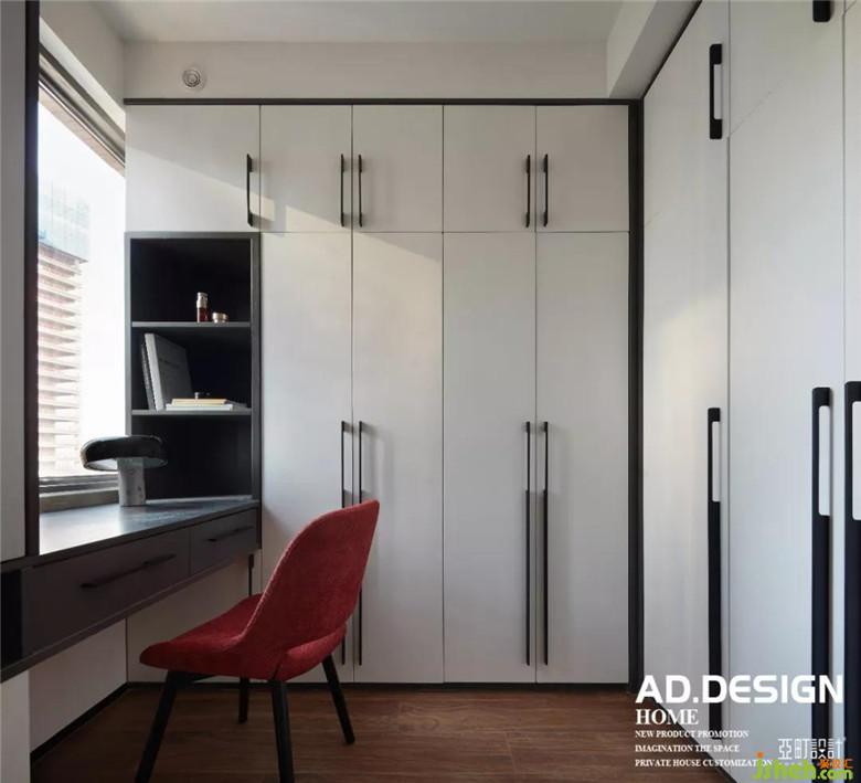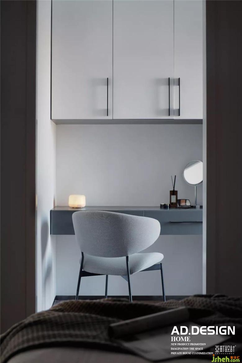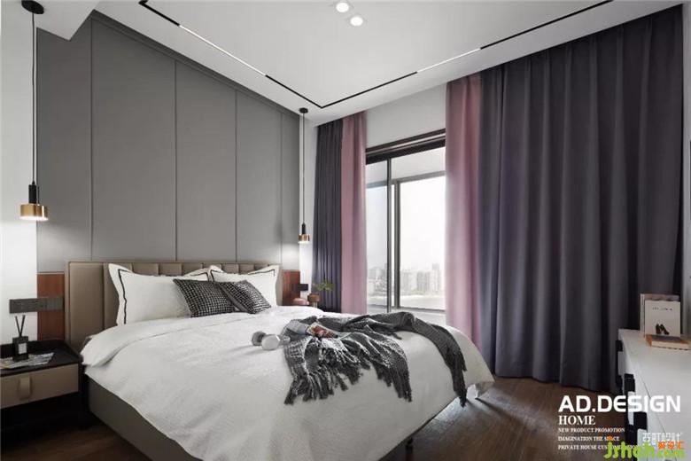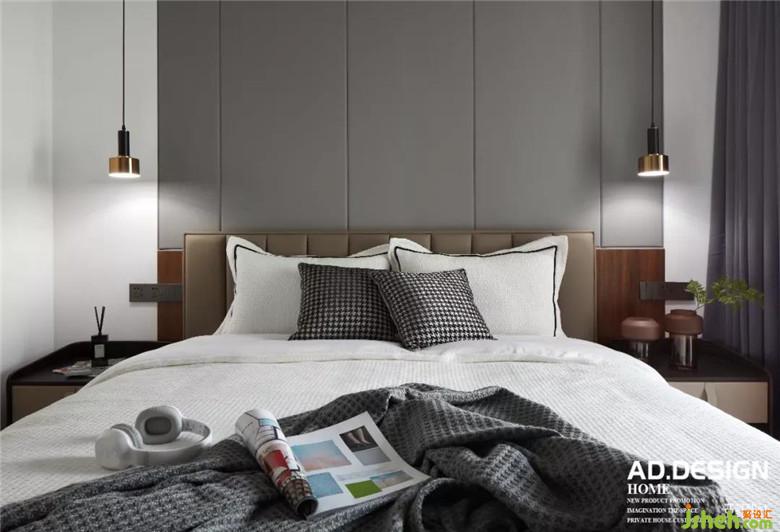 主臥空間裝修公司在床頭背景用部分的木飾面與客廳餐廳公共區(qū)域相呼應(yīng),硬包墻布的設(shè)計增加床頭的舒適度,豎向的分隔與電視墻面造型相平衡,在墻布的素雅的映襯下,頂面無主燈的現(xiàn)代照明設(shè)計讓空間更具高級感。