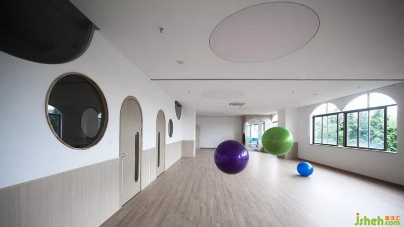 在其他空間的設(shè)計上同樣延續(xù)圓形的形狀去探索與孩子們的交流,希望能夠讓孩子們更快地去融入到這個空間里面;營造出像孩子們自己的家同樣的親切愉悅感受。在課室的墻上把教學黑板通過簡煉的幾何圖形設(shè)計,拉近空間環(huán)境與孩子們的心理距離。