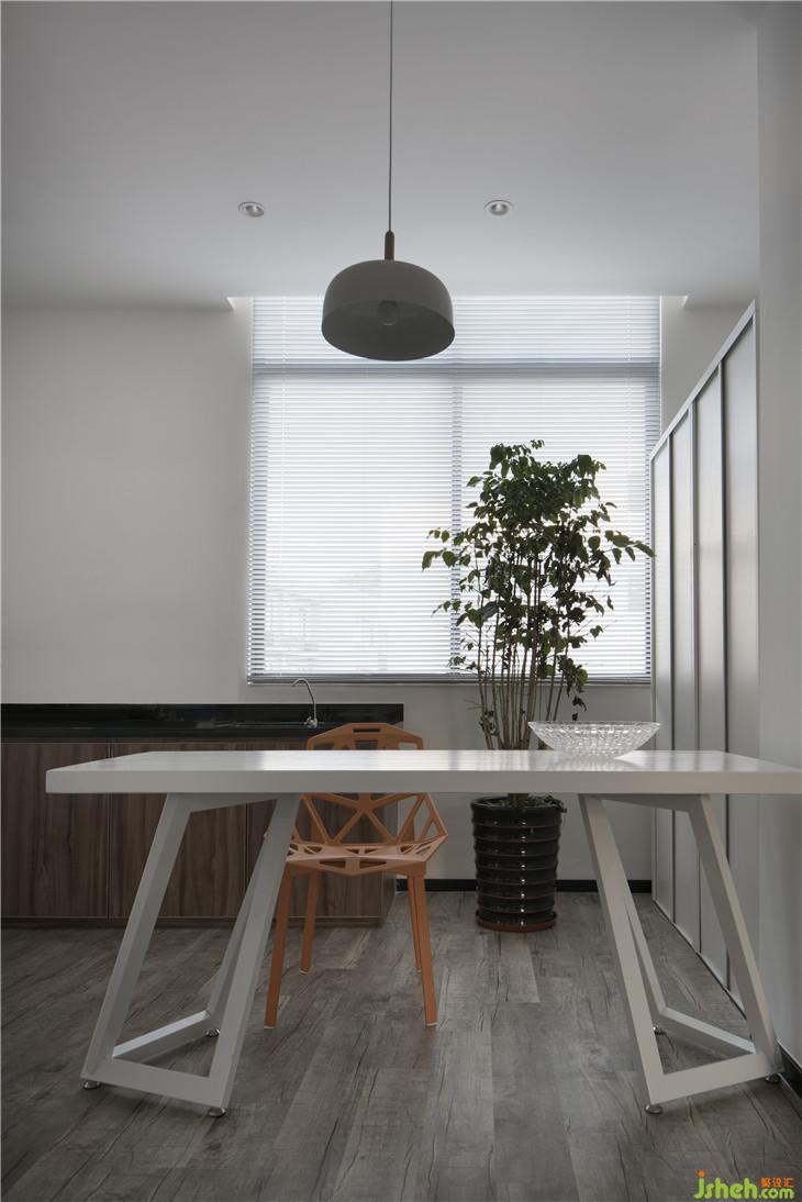 由于建筑結(jié)構(gòu)的限制,入口處需經(jīng)過一處較狹長的通道,索性將門口及通道墻面做成深灰色,營造一點(diǎn)神秘感,進(jìn)入室內(nèi)豁然開朗,墻面,天花,家具整體白色調(diào)。
