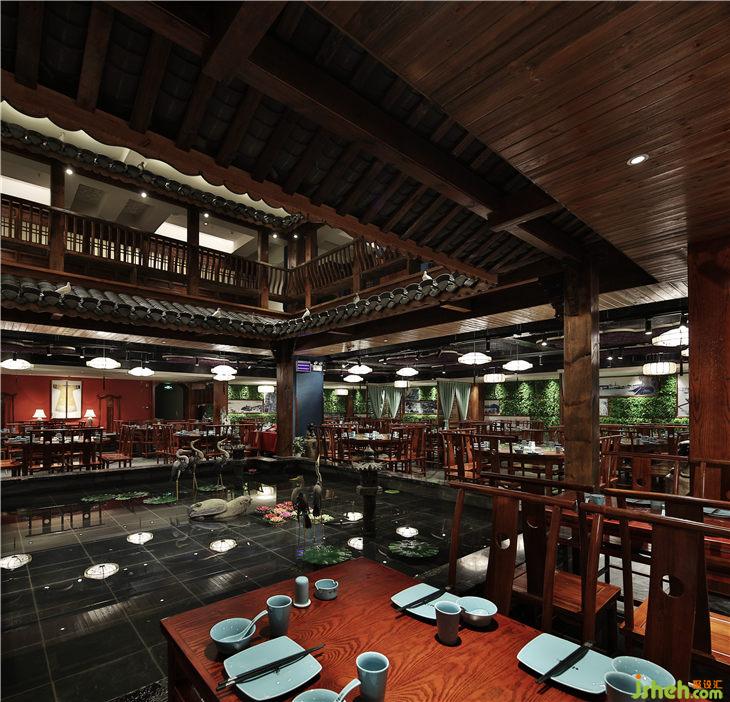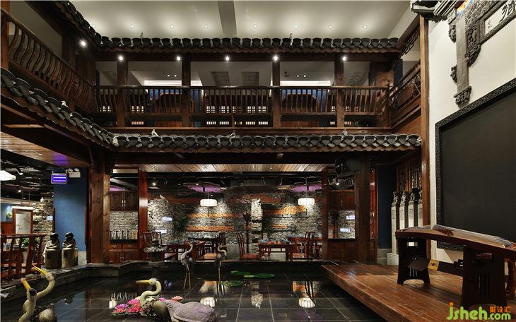 婉轉(zhuǎn)低沉的琴音,如深谷幽林那清脆撩人的一抹,行云流水那悠揚(yáng)自由的一刮,狂風(fēng)驟雨那驚駭滂沱的一搖……盡是自然的聲音,盡是心靈的聲音。室內(nèi)建筑-天井的設(shè)計(jì)在空間中尤為亮眼,使天、地、建筑在空間中融為一體,也體現(xiàn)了中國(guó)傳統(tǒng)文化中天人合一的哲學(xué)思想,空間中的主墻連接著上下兩層,用青石和水磨磚混合建成的門(mén)樓,精美的石雕佐以輕微的色彩點(diǎn)綴,莊重、矚目,四周落下的水滴,似雨水一般落入了中央的水池,水中荷花瑞獸各有神態(tài),古箏的彈奏便在此處,碧波之上,你我之間;