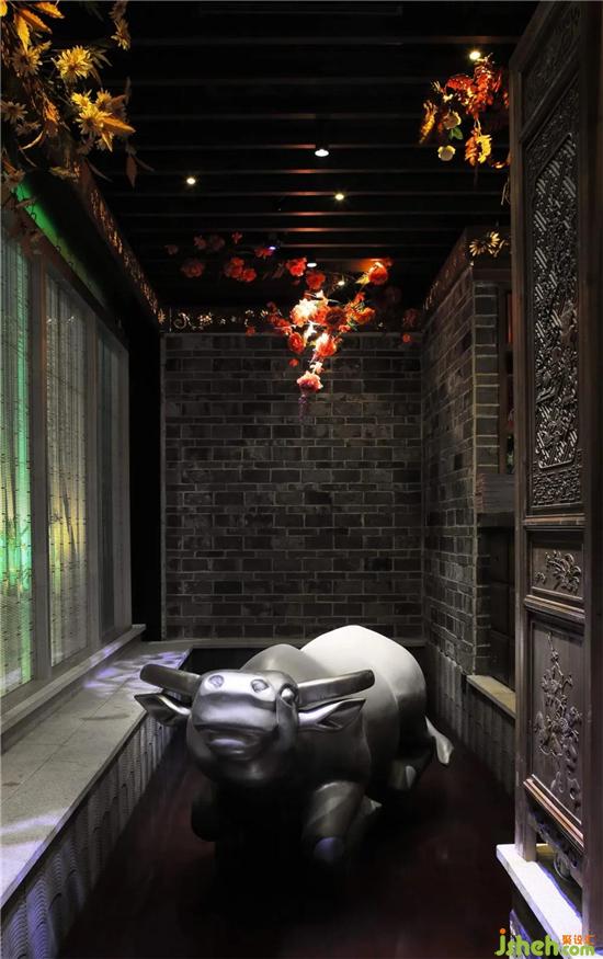 醉江南位于九江市潯陽(yáng)區(qū)原老汽車站前,隸屬老城中心區(qū)域這是一個(gè)二層建筑的改造,設(shè)計(jì)上取“江南”之意,著重體現(xiàn)中式建筑結(jié)構(gòu),將整體的用餐環(huán)境帶入江南的樓閣之中?!皹情w宜佳客”——南方建筑因氣候炎熱潮濕,所以一般以二層樓房居多,底層是磚結(jié)構(gòu),上層是木結(jié)構(gòu)。此次門頭的設(shè)計(jì),便是借鑒了這一特點(diǎn),一樓以外墻漆搭配石材及黑色不銹鋼,帶有寶瓶造型的玻璃門加上外墻大面積的玻璃設(shè)計(jì),即使站在門外也可以感受到餐廳的氣氛;二樓便是用木結(jié)構(gòu)造型,營(yíng)造樓閣的氛圍,搭配窗外綠植更添色彩。推門而入,站在小橋之上,水牛臥在水中,聽(tīng)著對(duì)面水車的聲響靜靜的遙望。透過(guò)紅楓樹(shù)望去,蓋瓦的屋棚,發(fā)光的牌匾,藍(lán)色的明檔墻磚,將這個(gè)空間跳脫出來(lái)。“一城一味”是對(duì)城市味道的寄寓,“三餐茶飯”是對(duì)家的渴望;門外的馬頭墻上運(yùn)用手繪和實(shí)物的結(jié)合,打造出鄰家的意境。拾級(jí)而上,玻璃磚搭建馬頭墻在虛實(shí)之間變換,中庭中間擺放著9個(gè)拴馬樁,名為“龍生九子”。江南多雨,屋瓦在建筑中既起了裝飾又有擋雨之用,設(shè)計(jì)中將此元素提出,并融入水景之中,低矮磚墻便體現(xiàn)屋檐延綿之感。云朵燈飄散于頂,對(duì)面的三個(gè)連亭的用餐區(qū),也與這延綿水景互相呼應(yīng)。宴會(huì)廳內(nèi)有一四角古亭,名曰陶然亭,另有樓中戲臺(tái),街邊小屋,馬頭墻做的墻面造型頂上編鐘吊燈,木制屋頂?shù)鯚?,發(fā)光的分色線條都增加整體空間的視覺(jué)和空間的延展。造一幕景,續(xù)一段回憶,去到江南,最難忘的或許不是湖光山色,而是那因緣而遇的煙雨饒山,自然之間的碰撞,躍然紙上的水墨美景,或許才是印象最深的。游江南,游的心還是景?醉江南,醉的是景還是心?餐廳設(shè)計(jì)