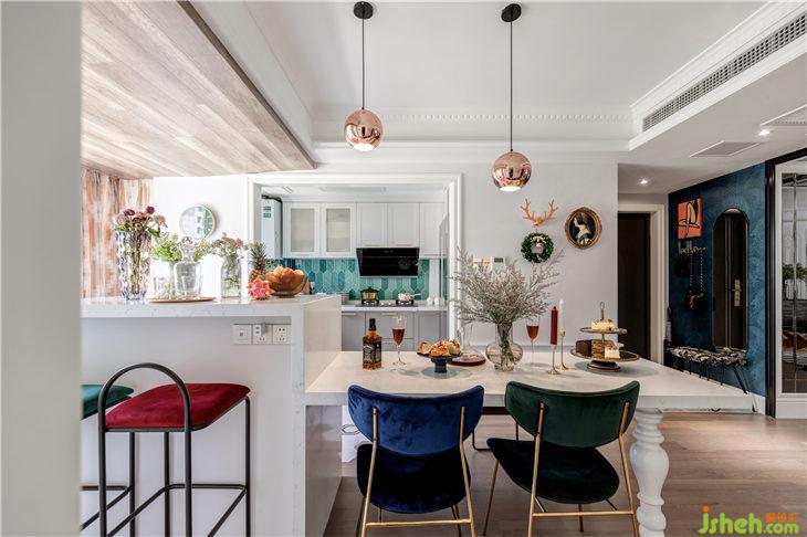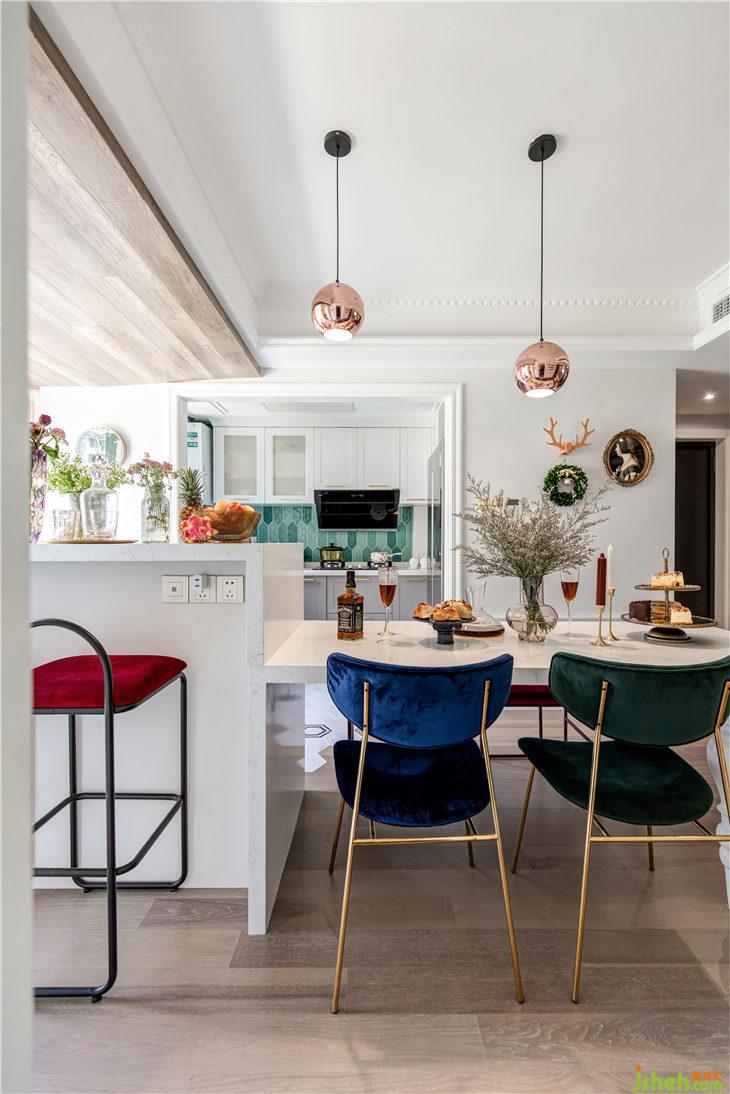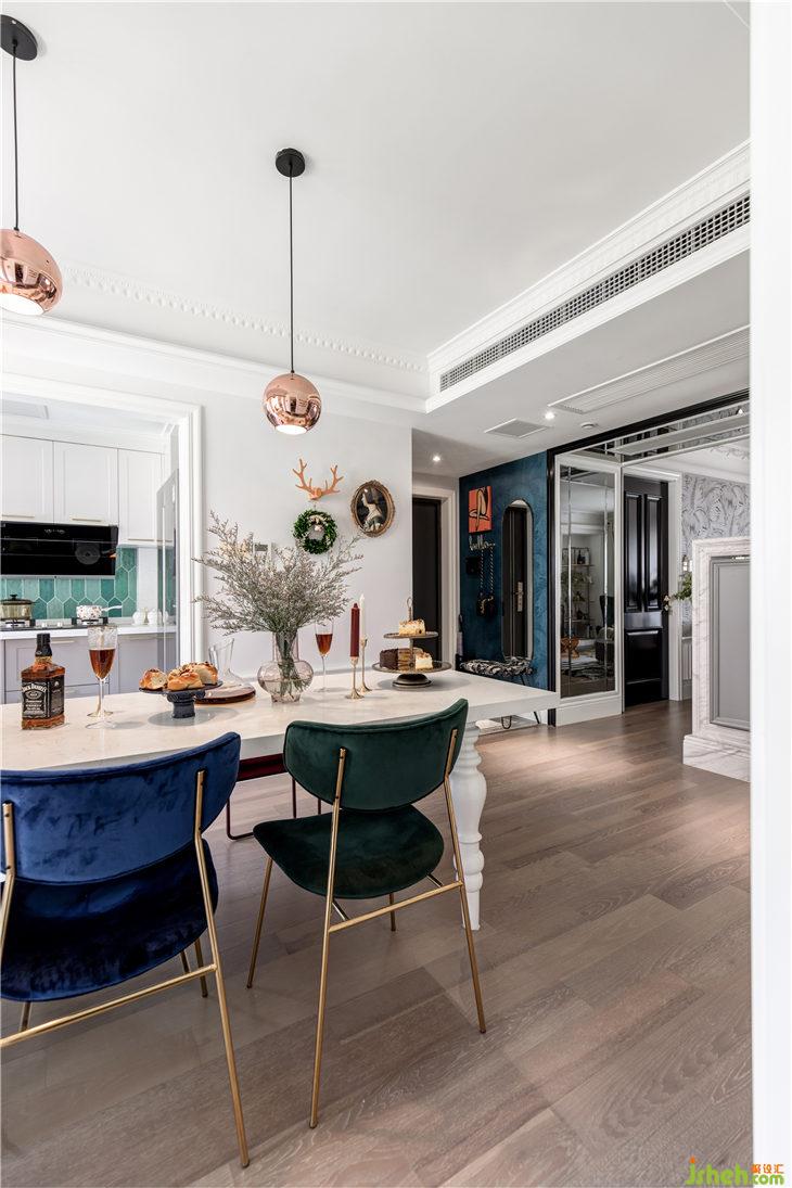 餐椅選用了寶藍+祖母綠+豆沙紅的搭配,亮面鈦金不銹鋼腿,不占空間同時又輕盈時尚。