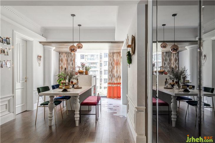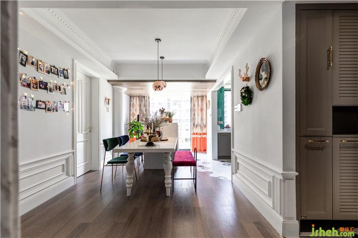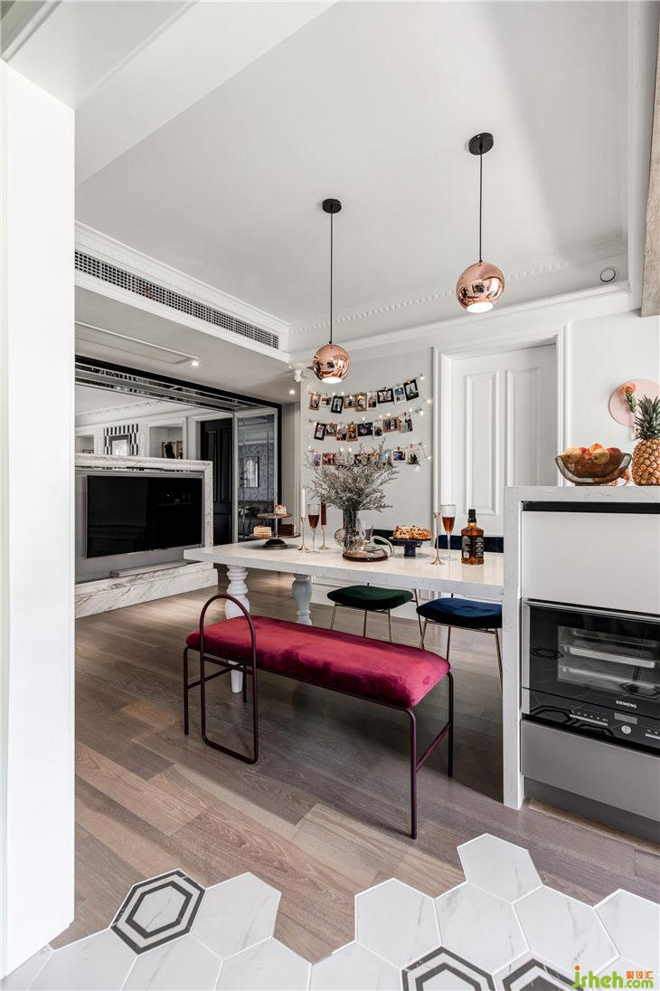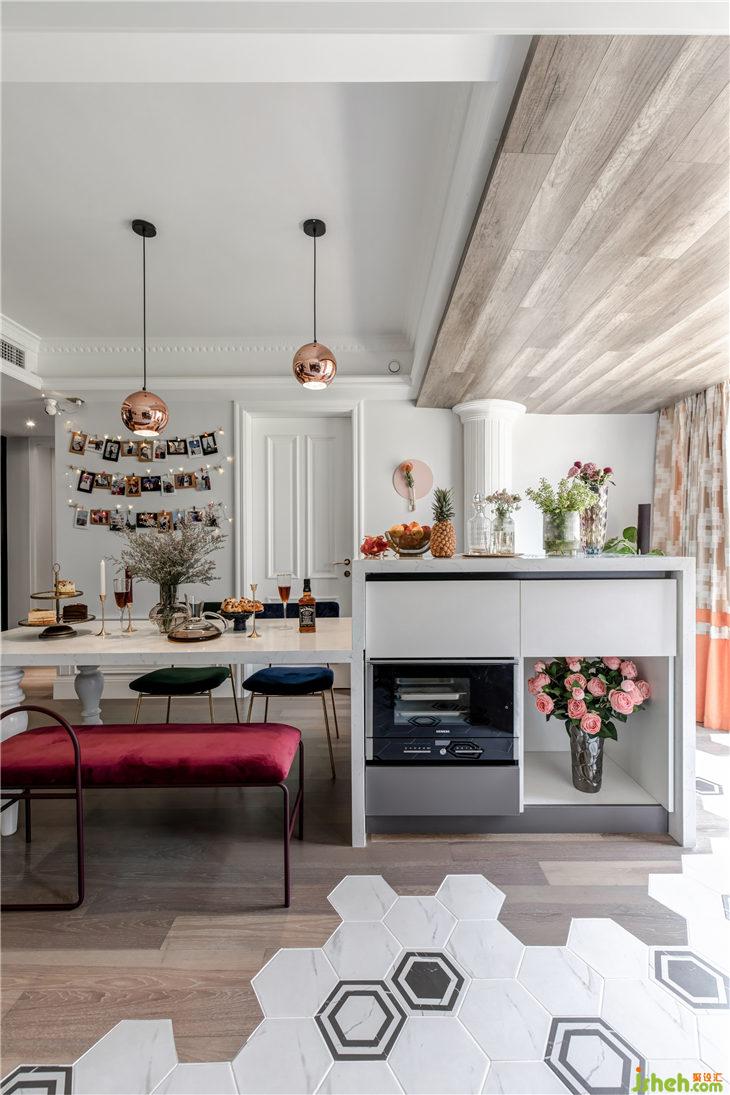 餐廳地面,直鋪實木多層地板,與廚房六邊形拼花地磚自然無縫銜接。