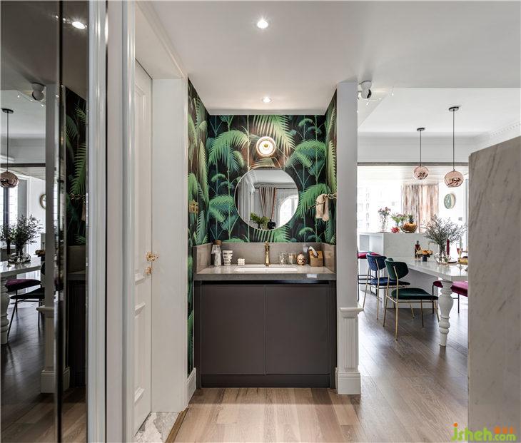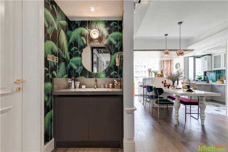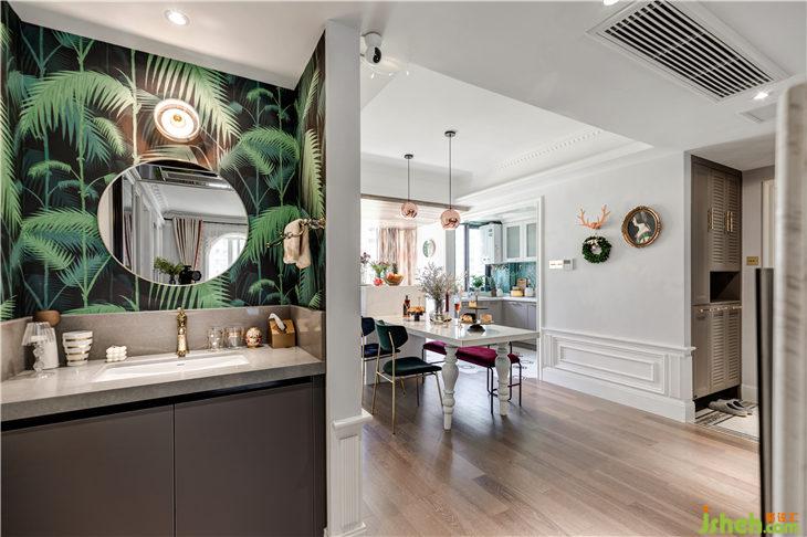 干區(qū)正好在客餐廳的中間過渡區(qū)域,我們將其融合到客餐廳里,選用了英國Cole&Son 進(jìn)口墻紙棕櫚樹,型號(hào)是:墨綠色 95/1003。