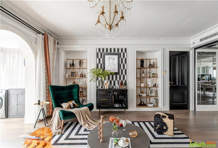 與主臥相連的這道墻進(jìn)行了凹凸組合,凹進(jìn)去的空間,正好抬高做兩個(gè)內(nèi)嵌壁龕,放置金屬展架,業(yè)主很多心愛(ài)的小擺件,和出去旅游淘回來(lái)的軟裝,名品酒水,組合成列,也成為客廳的一道獨(dú)特的風(fēng)景線。