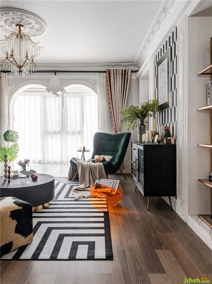 敦厚現(xiàn)代的圓形茶幾,下圈勾勒了一個金屬踢腳邊框,搭配了金色高腳小邊幾,現(xiàn)代感的家具時尚又不失格調(diào),與整體空間完美匹配。