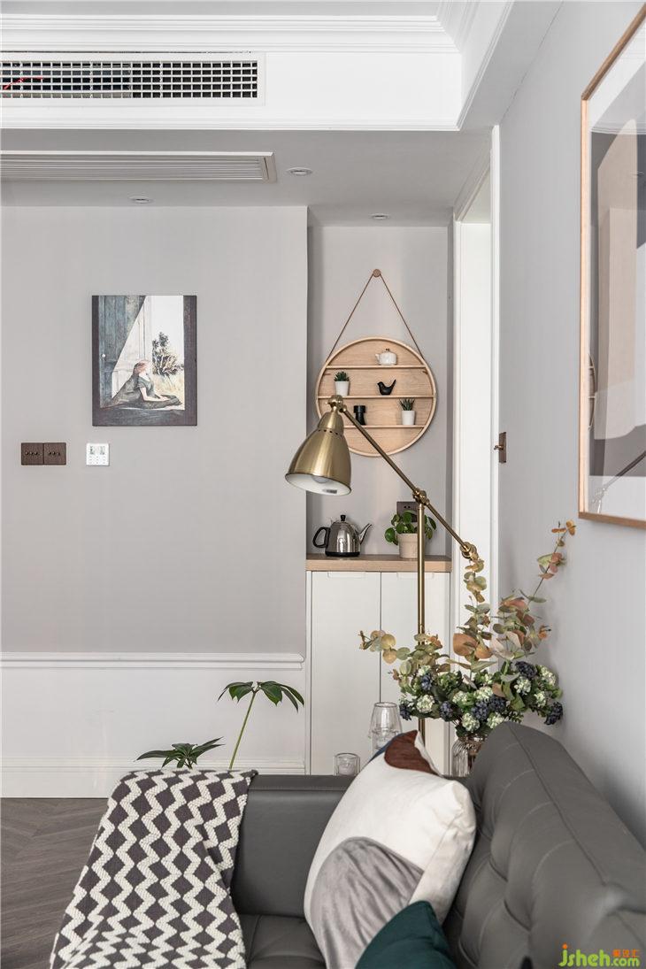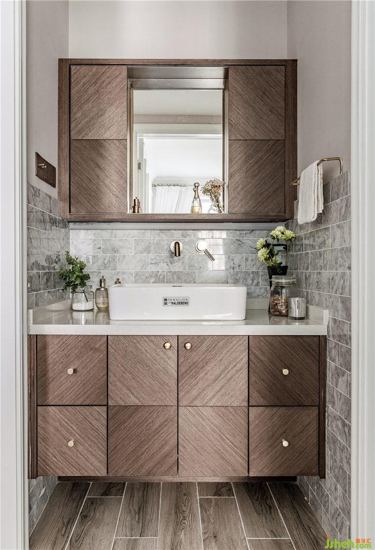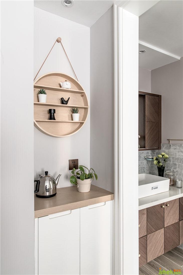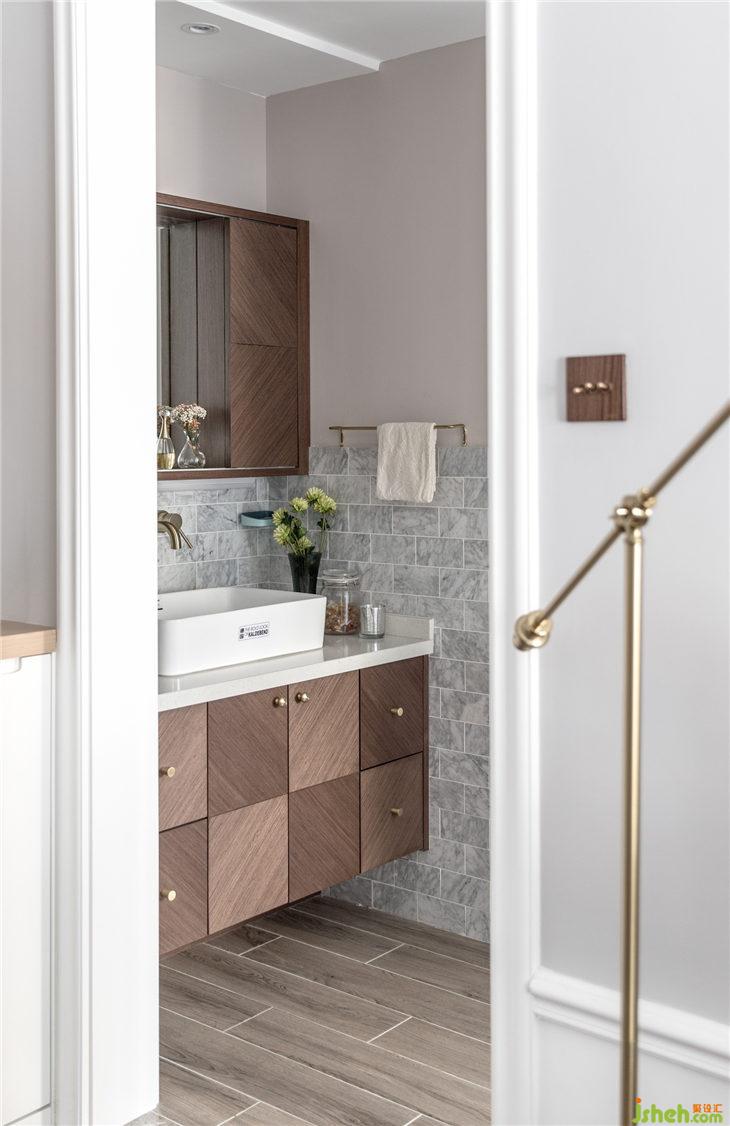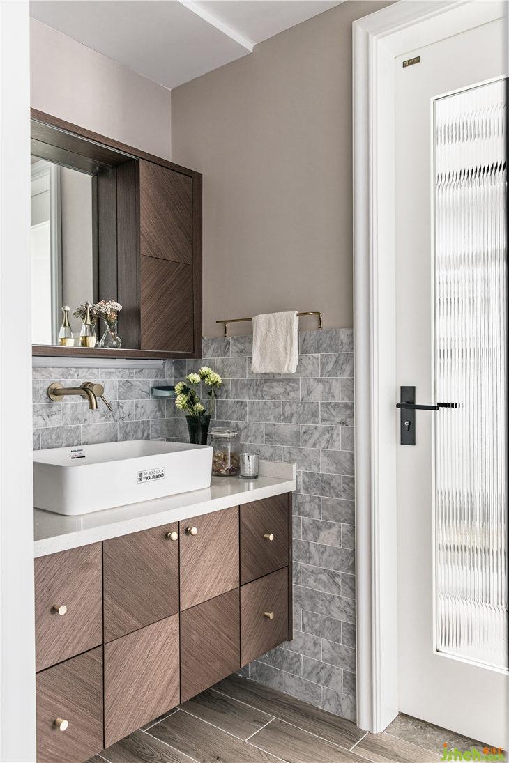 為了方便使用,設(shè)計師將干區(qū)獨(dú)立出來,搭配隔壁的茶水臺,讓動線更加流暢。干區(qū)的大理石馬賽克同樣采用半高貼法,半磚半漆的設(shè)計可以在視覺上擴(kuò)大干區(qū)空間。