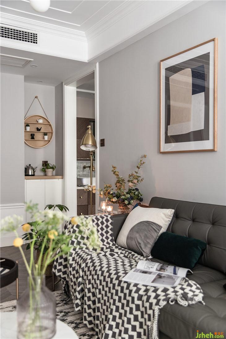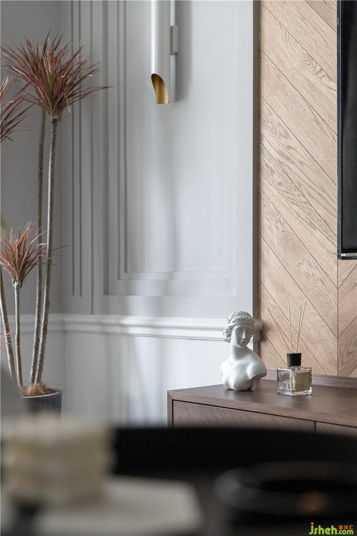 門板的細(xì)節(jié)展示,黑胡桃木飾面45°斜鋪,木飾面紋理有種金屬拉絲的效果,點(diǎn)綴了金色把手,對細(xì)節(jié)的要求就是對生活的追求。