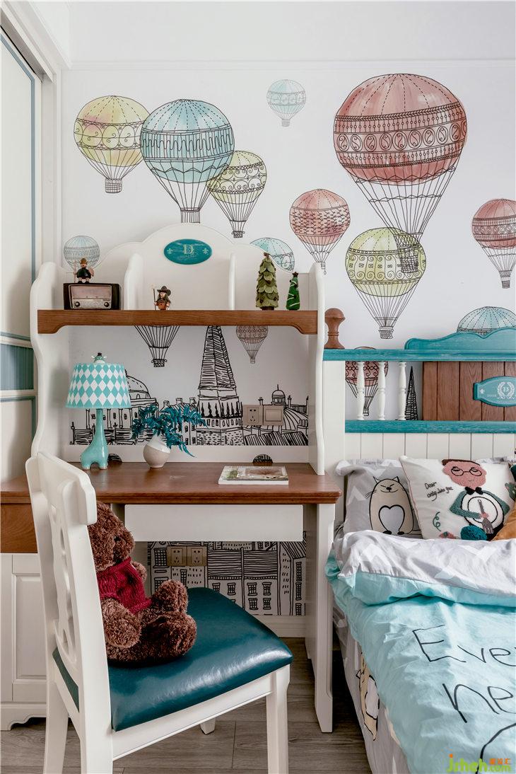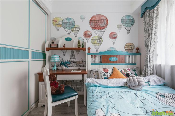 業(yè)主家有個四歲的小男孩,兒童房我們選配了環(huán)保等級很高的美式實木家具,淺孔雀藍配搭玳瑁色原木家具,氣球背景墻布的沙漠紅與成品家具顏色相互呼應(yīng),窗簾的幔頭我們也選配主打淺孔雀藍,比斯開灣藍色收邊體現(xiàn)精致感,貓頭鷹燈具與壁燈造型相映成輝,紗簾上的小氣球,每個細節(jié)都體現(xiàn)了設(shè)計師的用心之處。