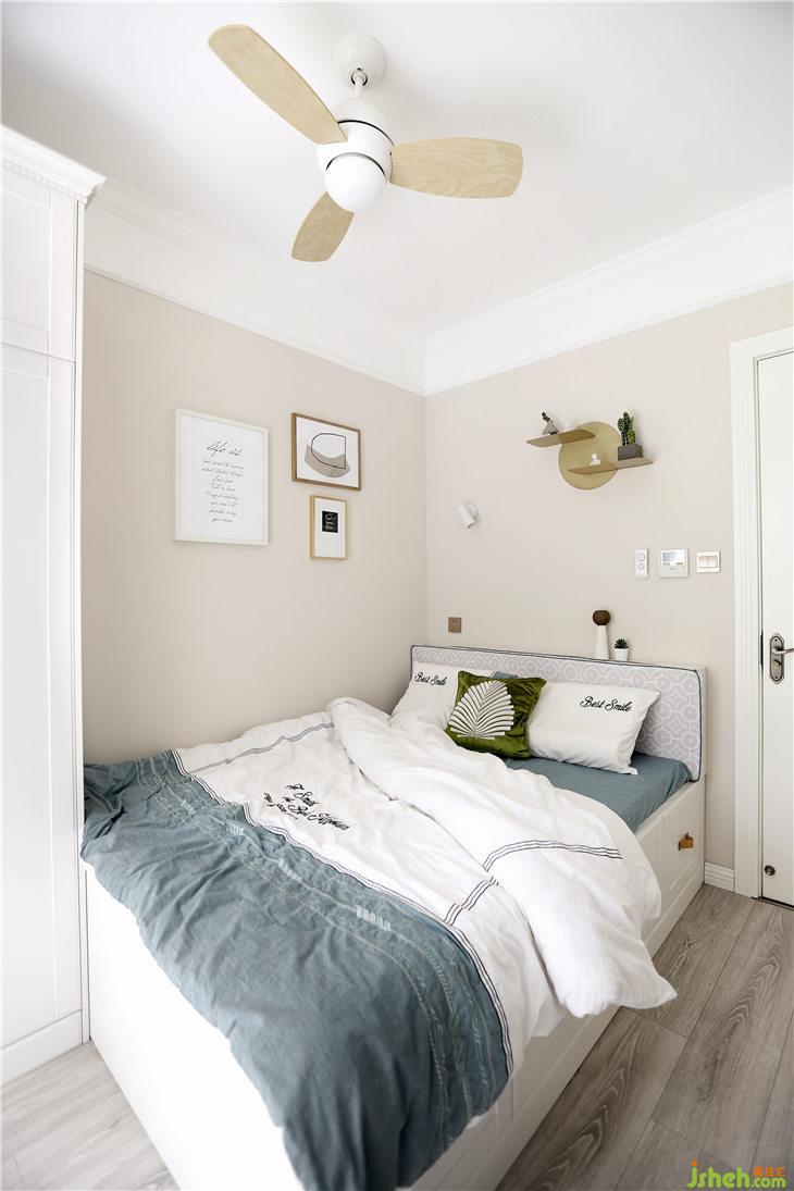 次臥空間不大,與南陽臺相同,采光充裕。放置了一米五的床,定制了一個窄衣柜,就已經(jīng)充滿了房間;因此我們墻面選用了清新淡雅的白鷺色乳膠漆,搭配暴風(fēng)雨灰色系床品,點綴雪松綠抱枕,讓空間盡量的明亮清爽,單配精選的墻面掛飾和吊扇燈,簡約而又富有生活趣味。