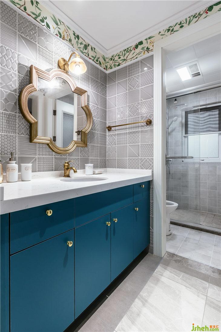 孔雀藍的柜門是專門定制的,把手特意選了亮金色,凸現(xiàn)氣質(zhì)。