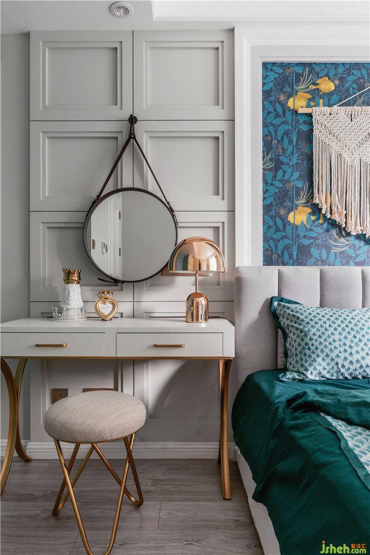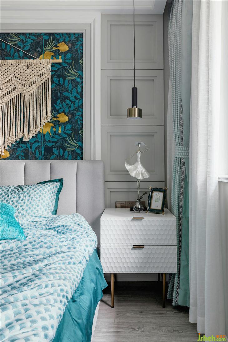 柔和藍(lán)的衣柜與床頭背景等比例切割,點(diǎn)綴精致手工錘紋把手,柔美的靜謐無處渲染。