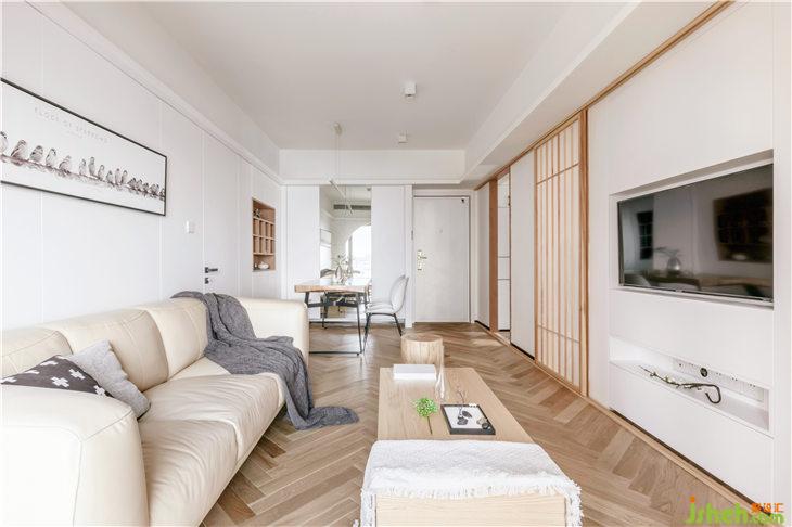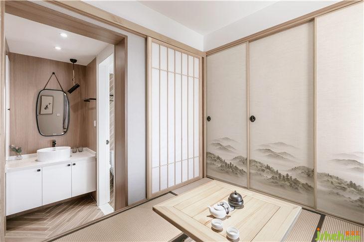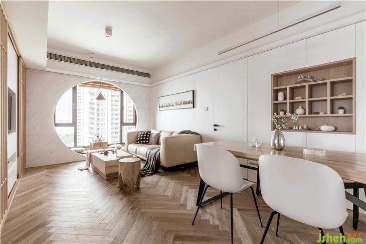 客廳地面鋪設(shè)人字地板,門套以及移門皆使用和室風(fēng)格的木質(zhì)材料,沙發(fā)背景墻白色護(hù)墻,豎向抽縫,與主臥門材質(zhì)統(tǒng)一,融為一體;客廳陽臺(tái)飄窗,是最佳的觀景空間,我們將飄窗打造為一個(gè)休閑空間,讓這里成為品茶閱讀的休閑觀景臺(tái)。