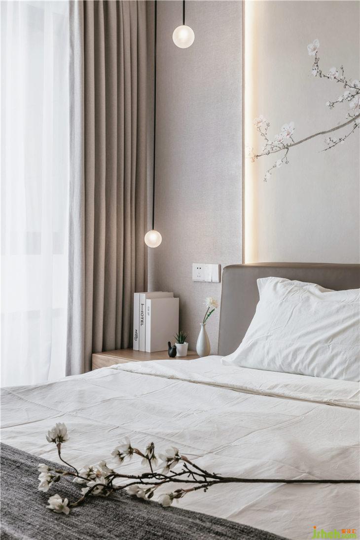 主臥地面延續(xù)客廳的人字地板鋪貼,背景墻使用硬包并抽豎縫,與客餐廳背景墻的抽縫相呼應(yīng);兩個床頭柜上方,選用壁燈和吊燈的不對稱設(shè)計,使得空間更加活躍靈動,床背景中間點(diǎn)綴梅花枝葉壁畫,一幅東方禪意之美應(yīng)運(yùn)而生,主臥右側(cè)內(nèi)藏了一個完整的衣帽間,延用了日式隔斷移門無地軌的設(shè)計,這幾處門的設(shè)計又恰到好處的詮釋了我們的風(fēng)格定位。