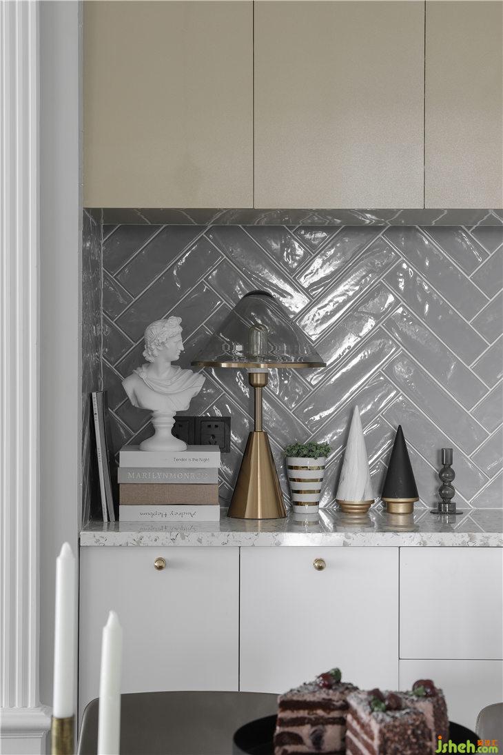 吊柜下口內置了燈帶,方便爺爺奶奶起夜喝水使用,灰色凹凸釉面的長條面包磚,進行人字鋪貼,自然的圍合了餐邊柜,這里不光是一個簡單的柜子,也是承載了家人起居生活很重要的功能。
