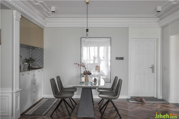 原有的豬肝紅入戶門我們做了出新處理,統(tǒng)一成啞光白,入戶與餐邊柜都統(tǒng)一定制了同款灰色花紋地毯。