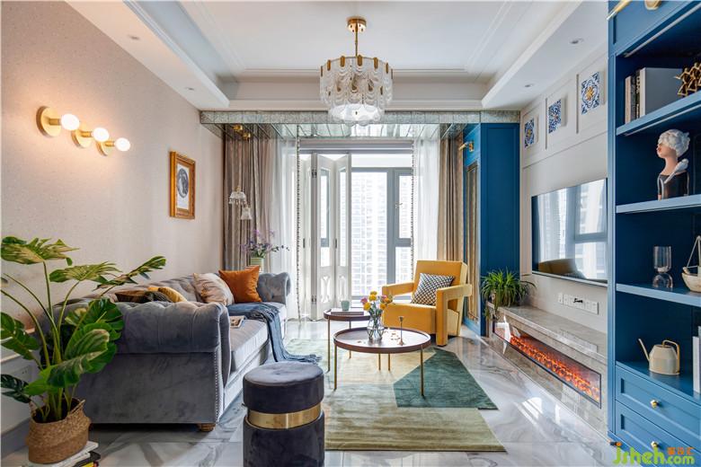 客廳整體色彩層次豐富,但遵循統(tǒng)一呼應(yīng),沙發(fā)背景選用粉色壁紙,電視背景選用與餐廳淺藍(lán)色柜體同色系的深藍(lán)色,主吊燈與餐廳吊燈材質(zhì)統(tǒng)一,與陽(yáng)臺(tái)間下掛的建筑主梁,低于吊頂高度,而且較寬,區(qū)域相對(duì)壓抑,這里使用了車邊仿古鏡包裹,讓空間打開。