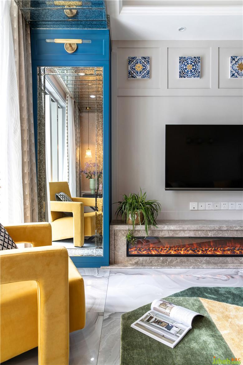 陽臺一側(cè),洗漱池與洗衣機(jī)臺面高低錯落,頂部有效的空間都定制了收納柜,顏值與功能兼得;地面選用藍(lán)色系拼花地磚,呼應(yīng)整體色調(diào)。