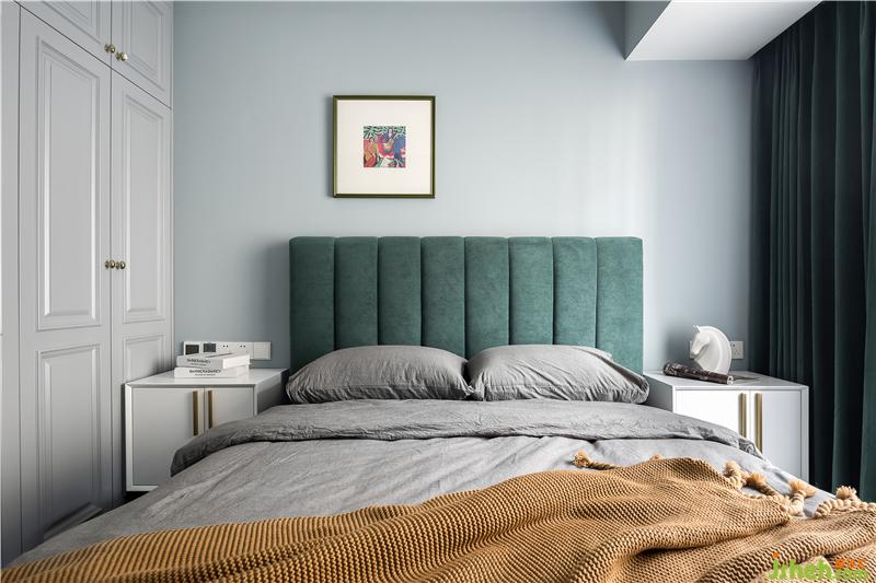 藍色的背景墻加上簡約的裝飾畫,清新而大氣。深色的簡約大床呼應睡眠空間的整體風格,更顯穩(wěn)重大方。