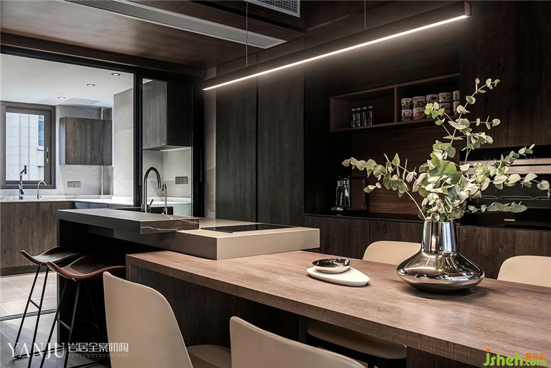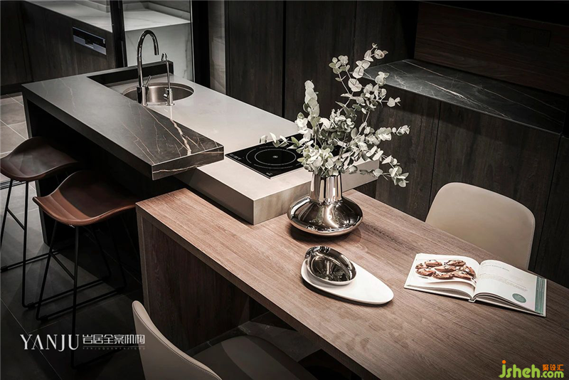 巖居設(shè)計(jì)把島臺(tái)與餐桌連接到一起,且根據(jù)居住者身高做了吧臺(tái)、操作臺(tái)、餐桌三個(gè)尺寸的深化。