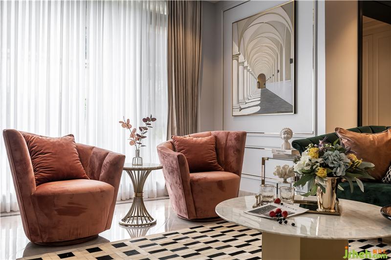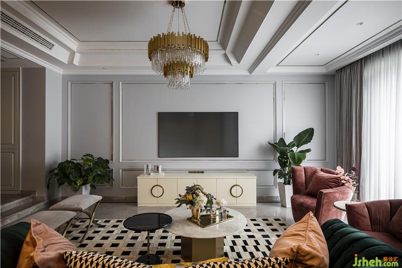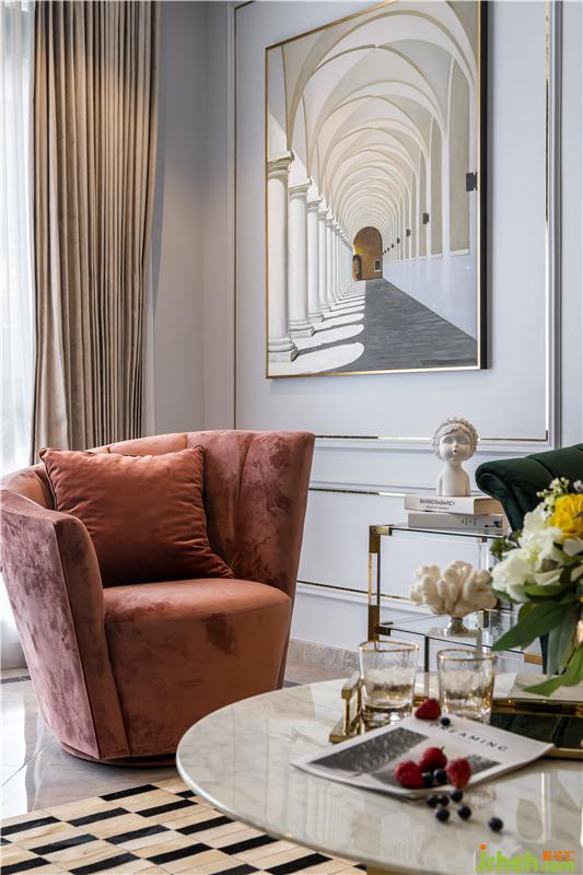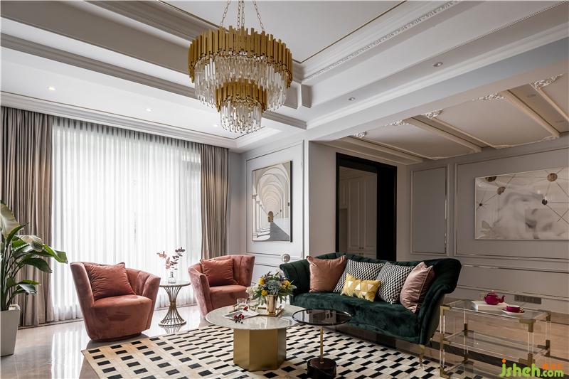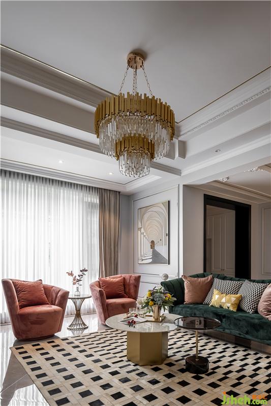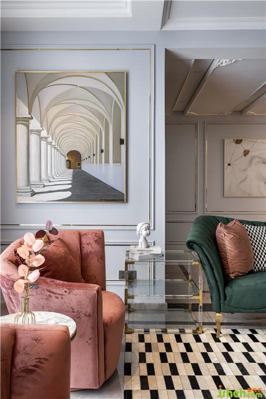 客廳選用靜謐淡藍(lán)和高貴金為主色調(diào),搭配皮粉及墨綠色沙發(fā),形成淡雅與尊貴的視覺沖擊。