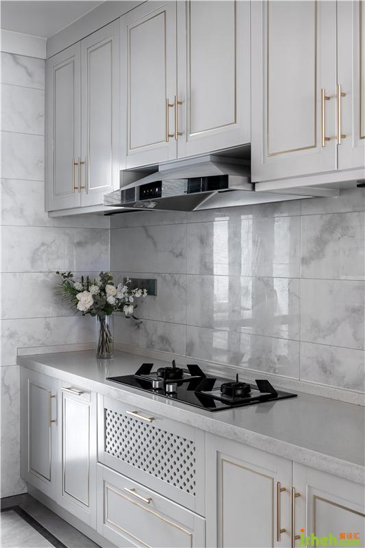 中廚與餐廳用玻璃滑門隔斷,白色的花磚與地磚融為一體,櫥柜的金色線條與餐區(qū)風(fēng)格統(tǒng)一,平衡視覺效果。