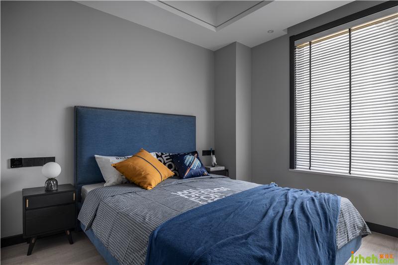 另一間兒童房以灰色墻面搭配藍(lán)色床品,輔之橙色、亮色的軟裝飾品,多重色彩更具層次,讓整個(gè)空間靈動(dòng)了起來(lái)。