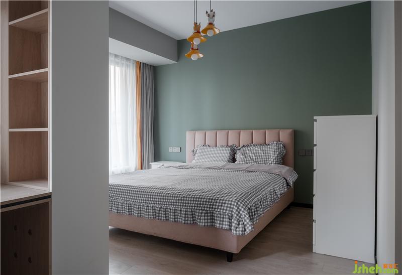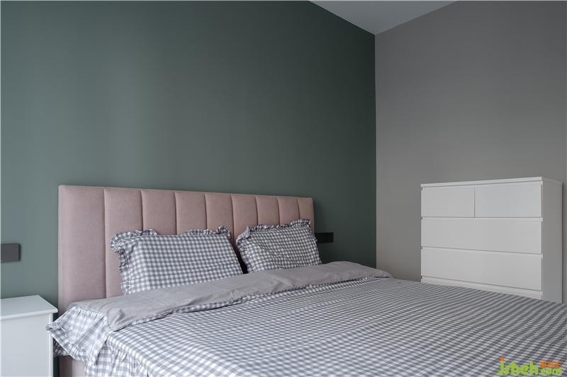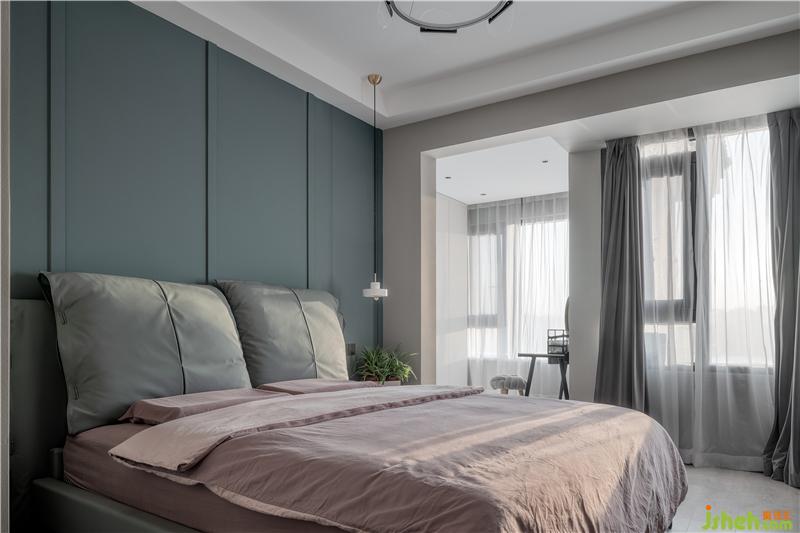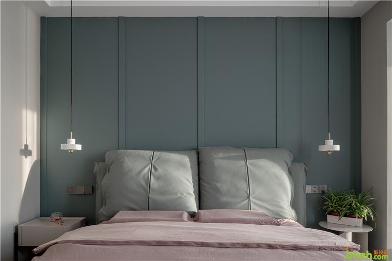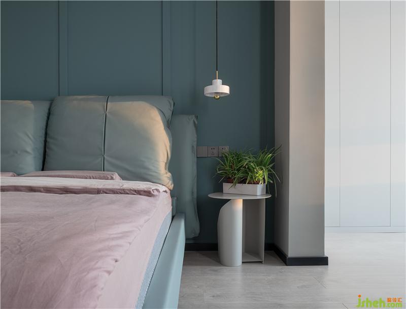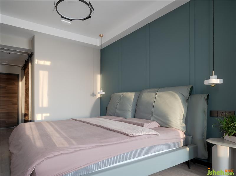 臥室寬大的床上鋪著柔軟舒適的床上用品,床頭背景墻沒有過多的裝飾,只是鋪滿了淡雅的藍(lán)色乳膠漆。造型簡約的床頭柜上擺放著臺燈和常用物品,室外的陽光透過玻璃窗灑進(jìn)來,讓整個臥室都沐浴在陽光下,給人一種明亮溫暖的感覺。