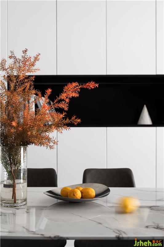 幾何一字型創(chuàng)意藝術(shù)吊燈簡(jiǎn)潔又不失大方,裝修設(shè)計(jì)搭配大理石餐桌,更具活力。餐邊柜與儲(chǔ)物柜結(jié)合,既能作為家庭儲(chǔ)物收納也能作為飾品展示區(qū)域,美觀實(shí)用。