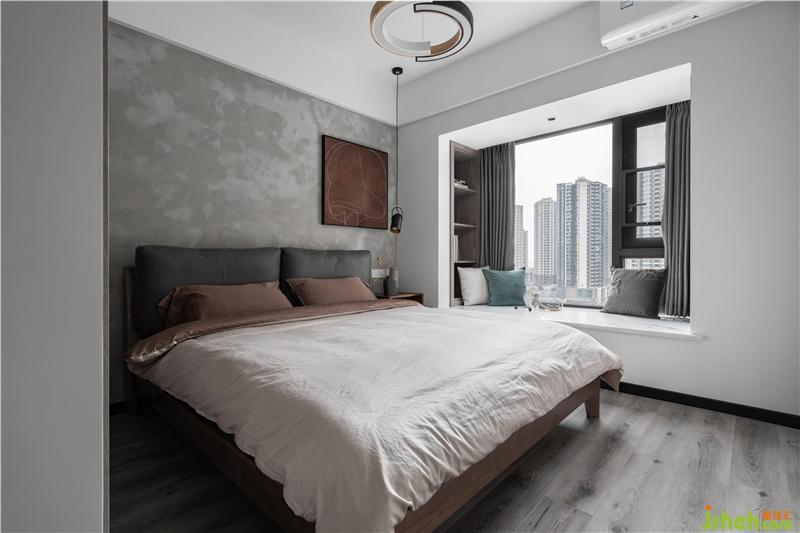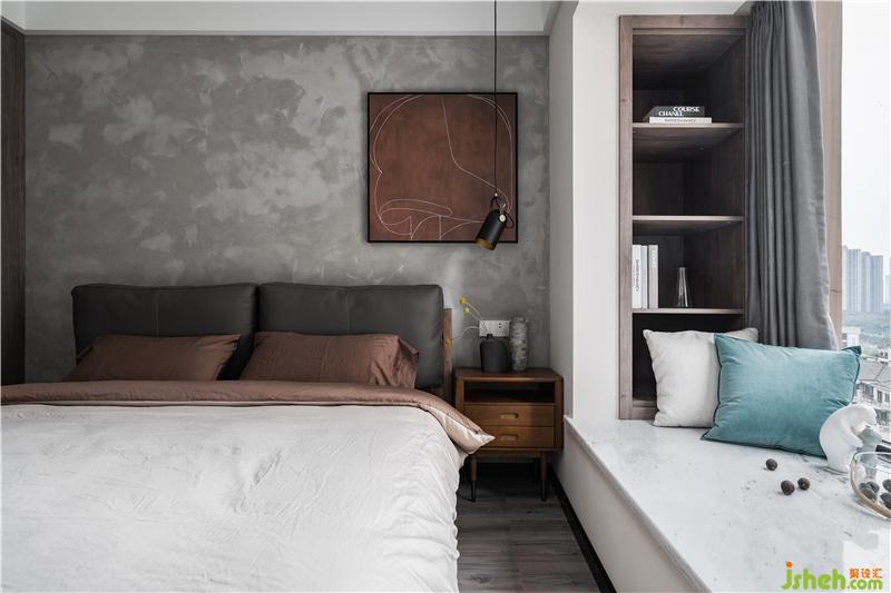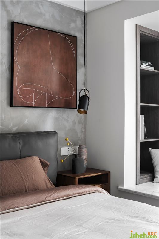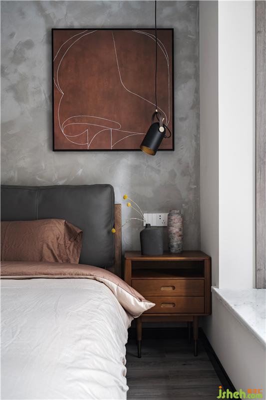 主臥室采用了水泥漆背景墻,胡桃色的裝飾畫與床品相呼應,皮質軟包的床頭造型、黑色的吊燈,為睡眠空間點綴了一些工業(yè)風,簡單且富有神秘感。