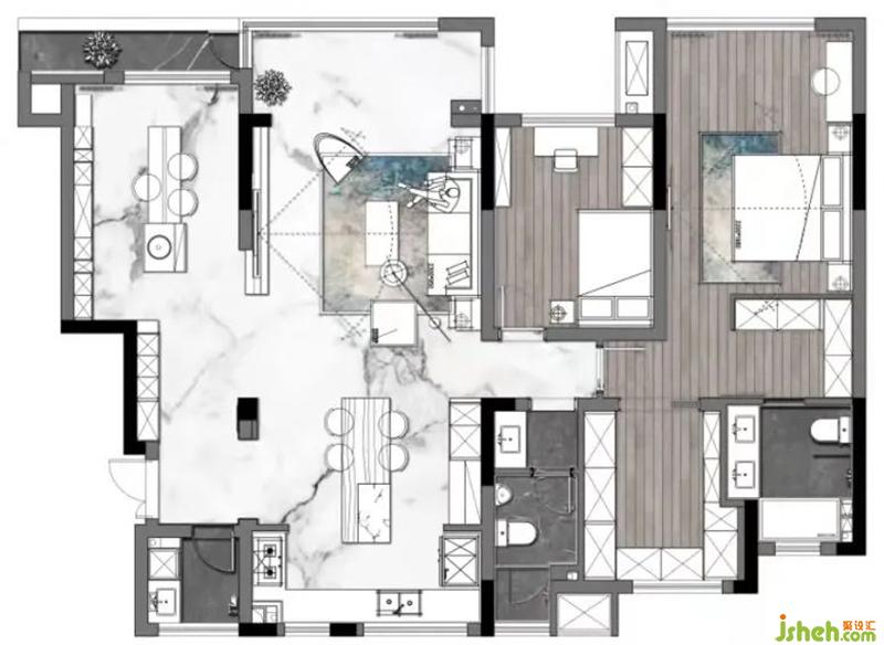 打開入戶隔墻,進(jìn)門的視覺效果得到延伸,入戶和開放式廚房自然融入。在采光得到改善的前提下,生活陽臺采用隱形門處理。適當(dāng)?shù)臒熝炯y讓空間質(zhì)感得以提升。