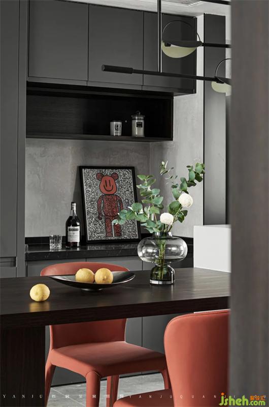 島臺和餐桌融合定制,高低深淺的搭配讓空間層次更立體,橘色餐椅的加入讓灰色的空間靈動(dòng)活潑起來。西廚島臺的木飾面上,用天然木皮來替代科技木皮,視覺效果更自然柔和。