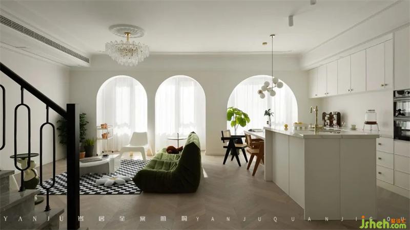 復(fù)式設(shè)計客餐廳保留了原始的橫廳結(jié)構(gòu),拆除了原有飄窗,改為三個拱形門洞,增加光影結(jié)構(gòu)和層次感,為兩個寶貝打造了一個可以躲貓貓的童趣空間;同時取消了電視柜和茶幾,給小朋友留下足夠的玩??臻g。