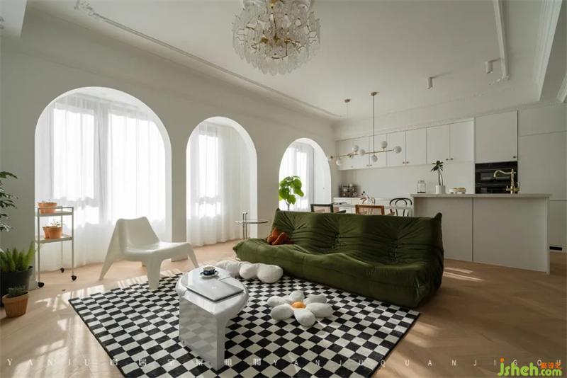 連接玄關(guān)與客餐廳的門洞設(shè)計成了拱形,與客廳的造型相呼應(yīng), 增添空間的層次感和古典韻味。